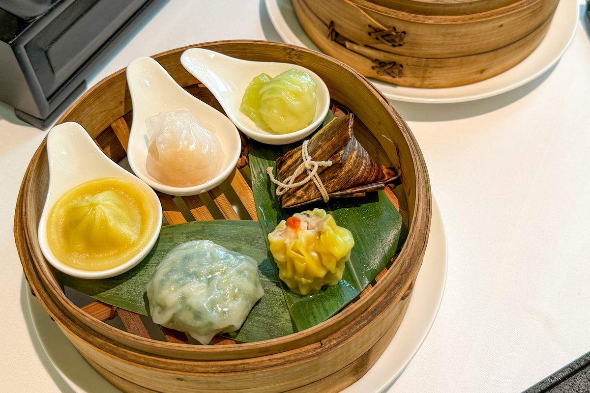 甘い甜点よりも好評だという点心セットからスタート。せいろの中に、色とりどりの点心が入っています。できたてほかほかで期待も膨らみます。 れんげの真ん中から時計まわりに「ぷりっと海老ハーカオ」「翡翠ぎょうざ」「プチちまき」「皇帝海老入りシュウマイ」「韮菜包(じゅうつぁいぱお)」「かに小籠包」です。