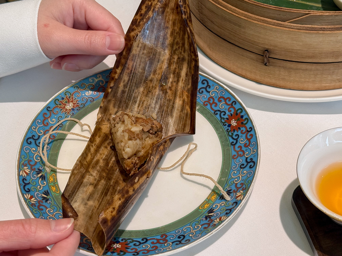 ちまきはミニサイズでとってもキュート。糸をほどく瞬間もワクワクドキドキ。開くと中には、軟らかく煮込み香味油で味つけした豚肉ともち米が。豚肉は香ばしくジューシーで食べごたえ抜群。もち米はふっくらともちもちした食感がたまらない!