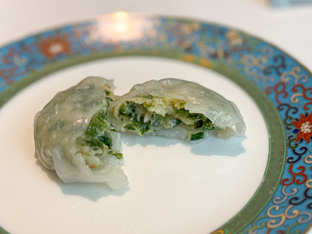 「韮菜包(じゅうつぁいぱお)」は、エビとニラをふんだんに使ったまんじゅう。エビのうま味とニラの風味が口の中に広がります。皮が薄めでエビとニラをダイレクトに感じられます。濃厚さがたまらず、ついもうひとつ食べたくなってしまいます。