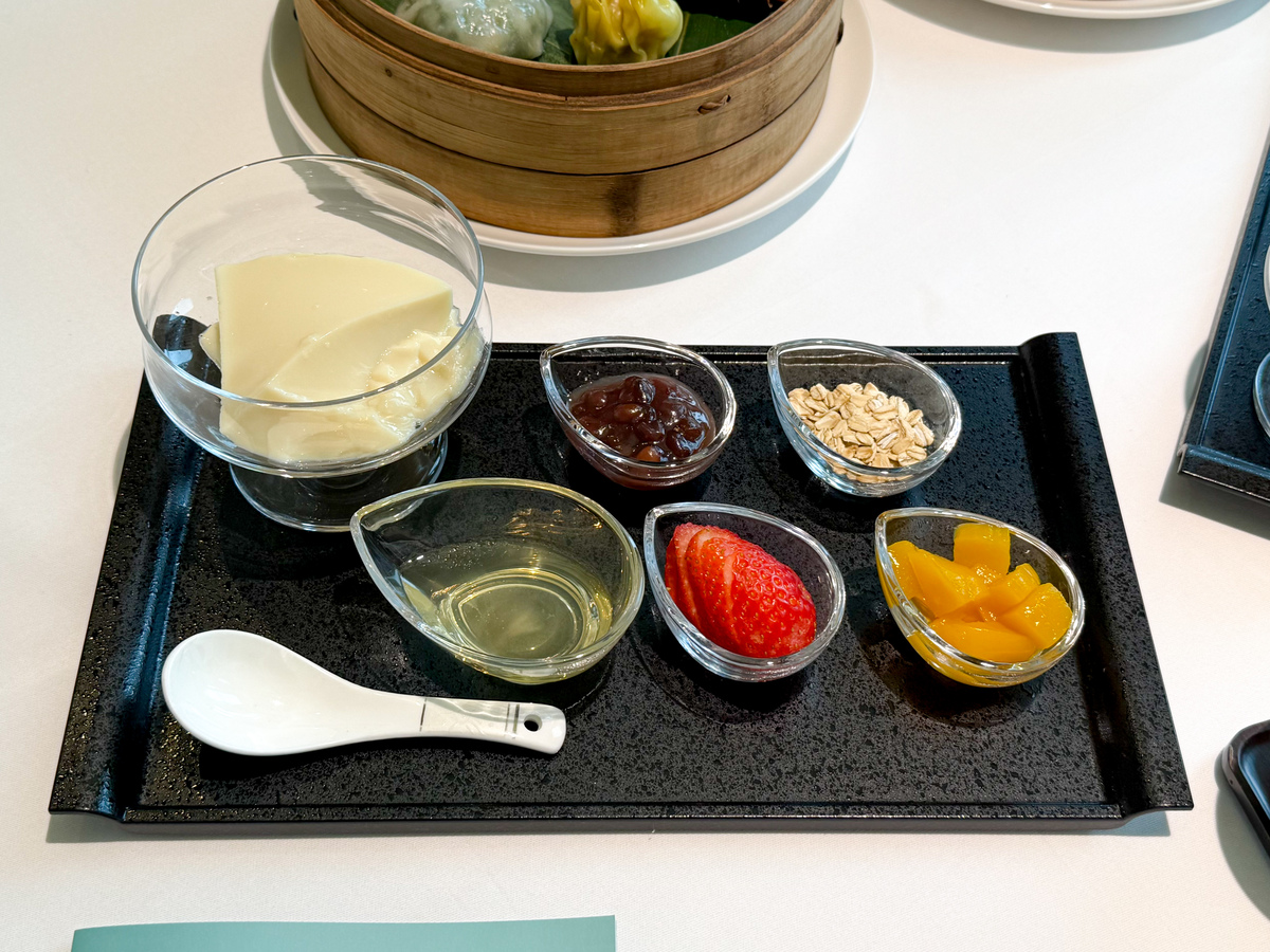 せいろに盛りつけられた点心、棚に飾られた甜点(てんてん)、フルーツ豆花(とうふぁ)、ドリンクのフリーフローがセットに。