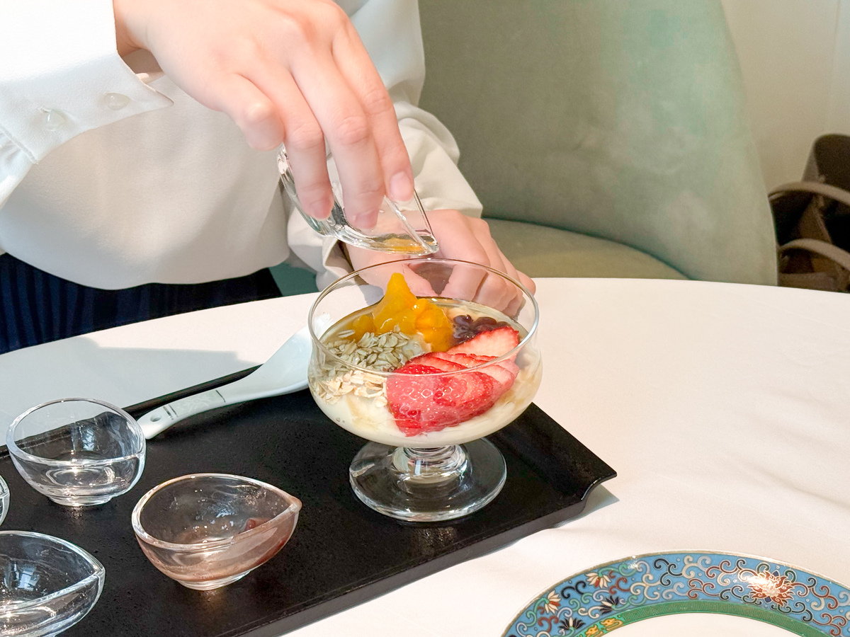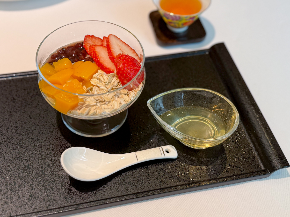 フルーツ豆花は、お好みでトッピングをしながら食べられます。豆花、小豆、オートミール、ジャスミンシロップ、スライスイチゴ、マンゴーがガラスの小鉢に入って提供されます。