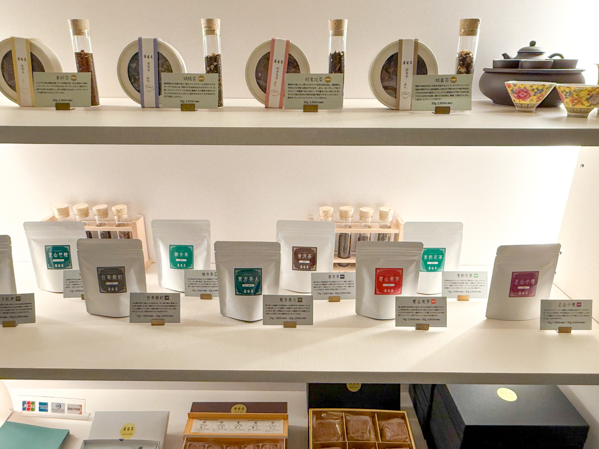 ストレス解消や胃腸を活性したい人におすすめの「健胃茶(けんいちゃ)」、血行の流れを活発にし肝に栄養を与える「養肝茶(ようかんちゃ)」、体内に蓄積された毒素を排出する「補陽茶(ほようちゃ)」、楊貴妃が愛したライチ紅茶やビタミンCを多く含むローズヒップなどをブレンドした「抗老化茶(こうろうかちゃ)」、デトックス効果が期待できる「排毒茶(はいどくちゃ)」といった、興味をそそるラインナップ。