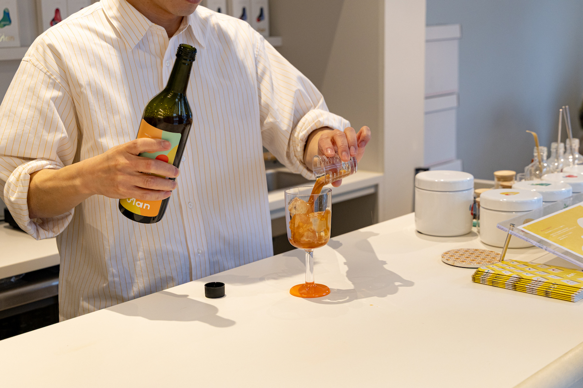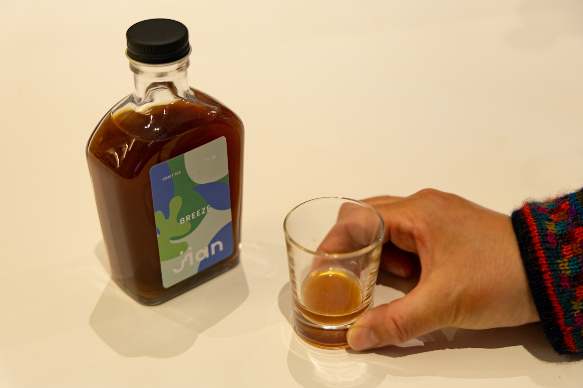 ティーシロップはショットグラスでのテイスティングも可能。気になるフレーバーがあれば味見をしてみてくださいね。こちらは、「巡りを整えること」に着目したフレーバー「BREEZE」。体では肝、季節は春に対応しています。