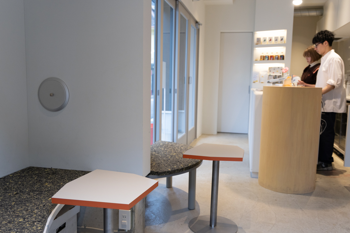 インテリアはシンプルながら、テーブルの形や石のように見えるウレタン素材のベンチに遊び心も見られます。カジュアルな雰囲気で、構える必要がないのもうれしいですね。「付かず離れず、でも、聞かれたら丁寧に答えます」とオーナーが言うようにお客さんとスタッフの適度な距離感も居心地のよさにつながっています。
