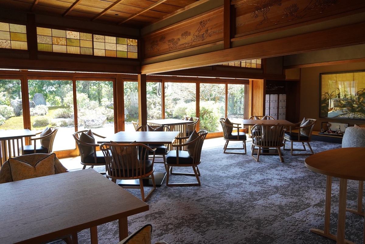 案内されたのは広いダイニング。伝統的な書院造りに京都在住の著名な和紙デザイナー・堀木エリ子さんによる光壁や光柱、障子和紙などがあしらわれています。堀木さんが過去に作られたさまざまな和紙を組み合わせた欄間がとっても素敵。ここでチェックインの手続きをします。