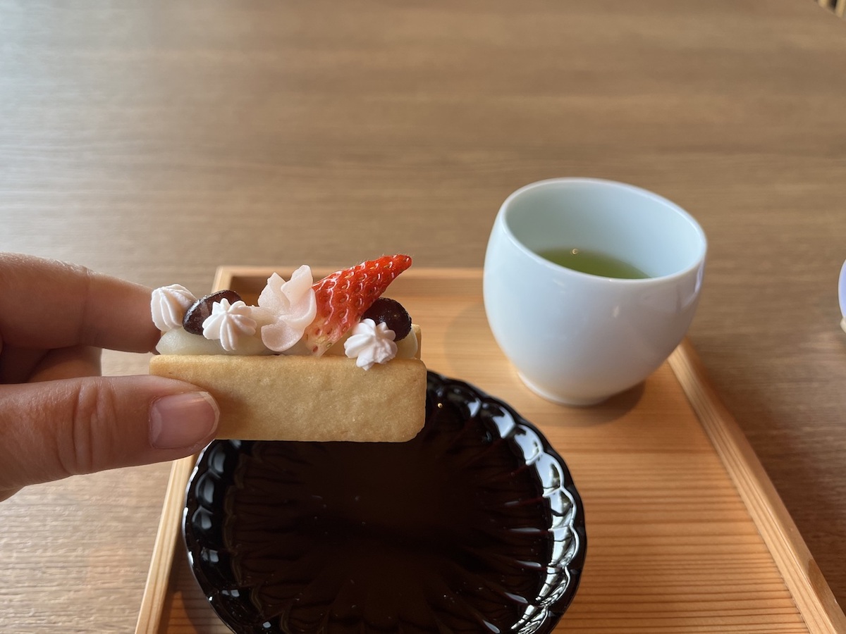 「移動でお疲れでしょうから、まずはゆっくりなさってください」と、お茶とお菓子をいただきながらチェックイン。やさしい甘さの「餡バタークッキーサンド」と京都のお茶屋さんの抹茶を加えた煎茶をいただきました。