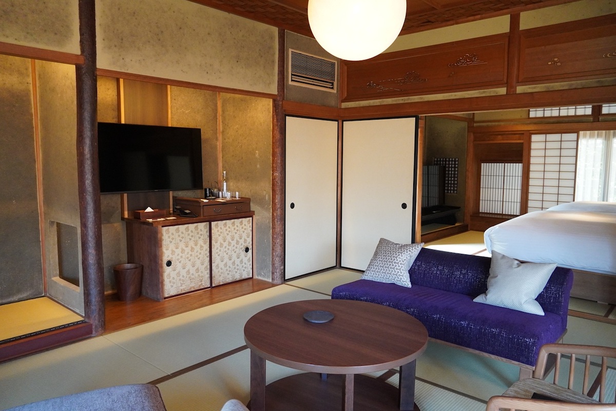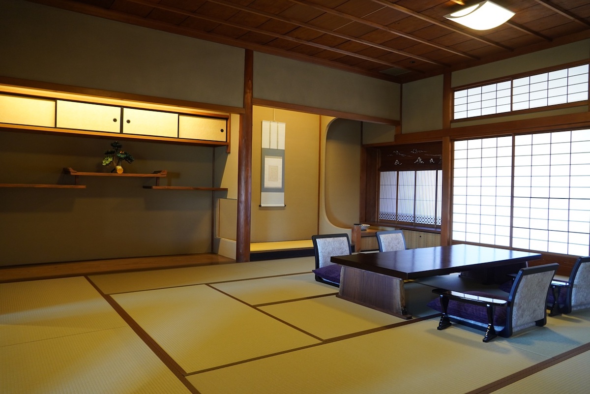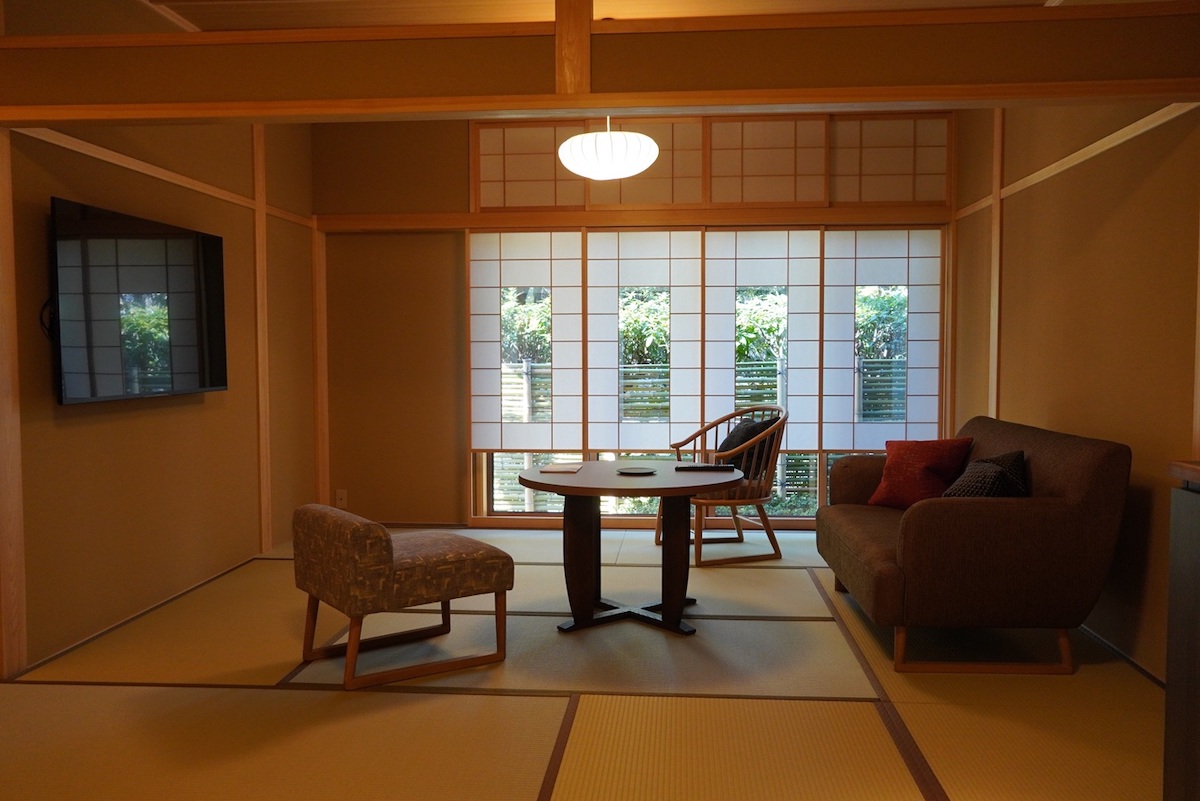 鳴滝本館離れ1階「禄(ろく)」は、2方向に縁側と専用の庭がある客室です。95.9㎡の室内は、お茶室の前室として使われていたそうですが、こんなに広い前室とは驚きです。