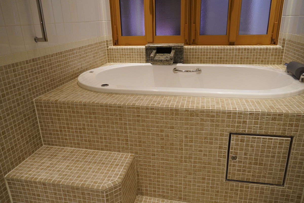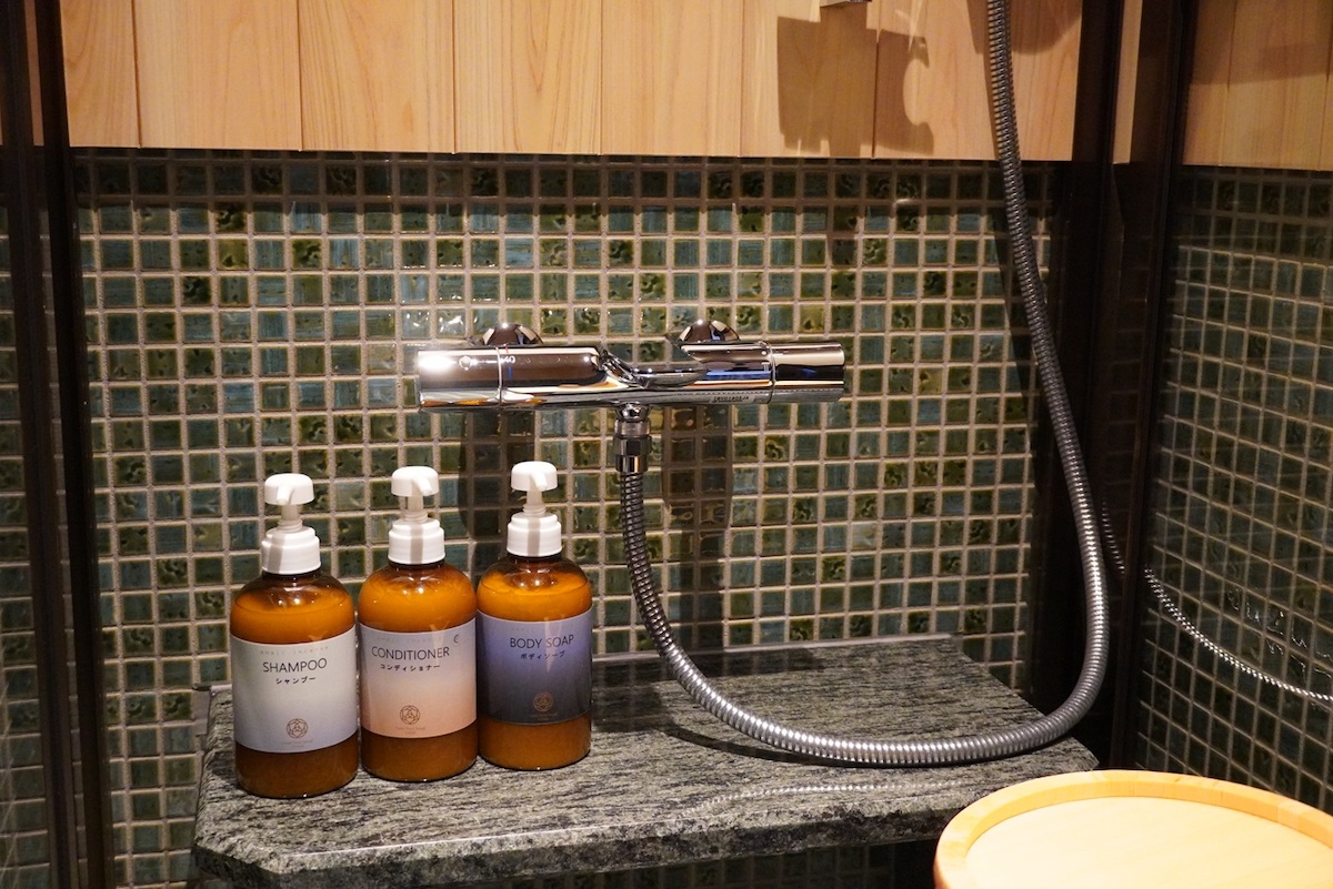 客室に入ったらすぐに入れるように、お風呂はちょうどいい湯加減で準備されていました。肩までつかれる深いタイプの湯船です。京都・清水にあるグループホテルの敷地から湧出する温泉を、毎日運び湯し、循環式なので24時間いつでも入れます。アルカリ性単純温泉なので美肌効果や疲労回復が期待できますよ。