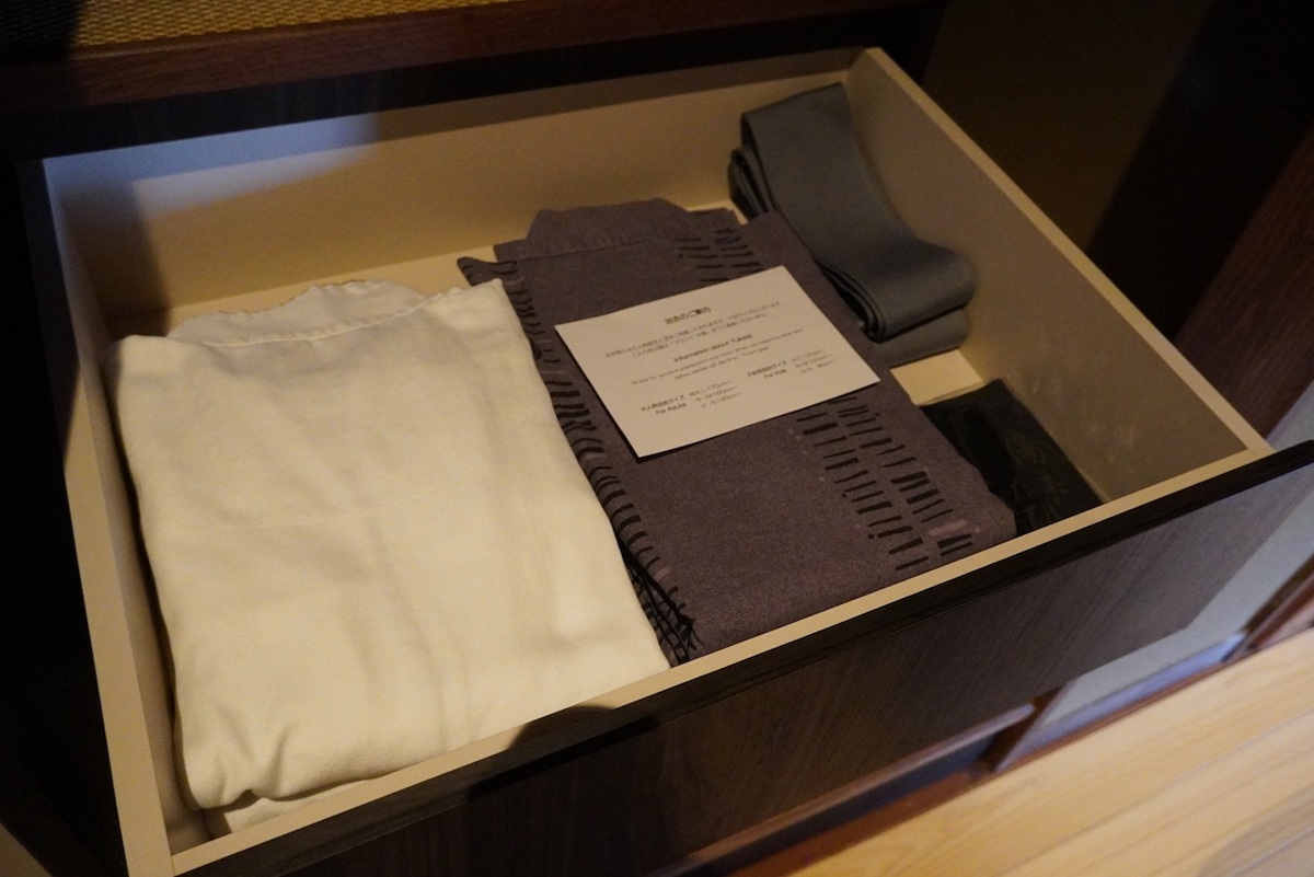各客室にはバスローブとパジャマ、浴衣、羽織があります。ダイニングや庭を含めて館内は、浴衣と羽織でOK。ローブとパジャマはお部屋のみのくつろぎ着です。