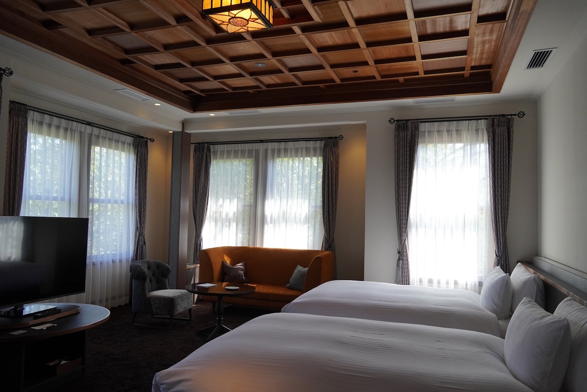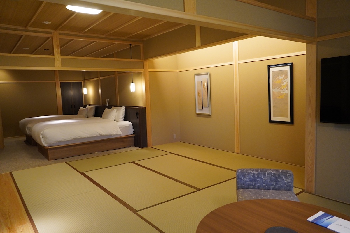 書院造の本館2階の「松」の客室は137.9㎡という広さで、レギュラーベッドが2台。3~6名で泊まる場合は広い和室に布団が敷かれます。3世代ファミリーやグループでの利用が多いそうです。
