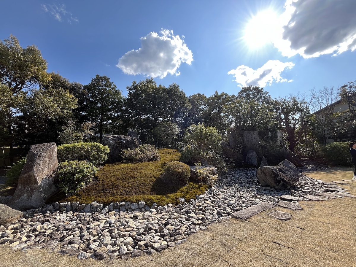 重森三玲氏が造った庭を散策してみました。蓬莱山に見立てた築山(つきやま)の前に、浜石と船石で海の景観を表しています。庭には茶室の庭などによく使われている京都産の鞍馬石がたくさん用いられています。