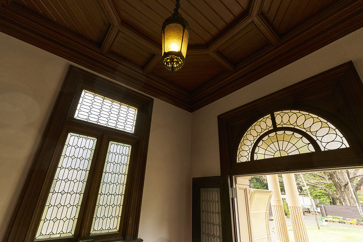 重厚な木製の扉の上部にあしらわれた、正面玄関のステンドグラスもみどころ。これも建物の設計を手がけたジョサイア・コンドルによるもの。庭園の緑を映し出せるように、ステンドグラスによく見られる鮮やかな色彩をあえて付けていないそうです。