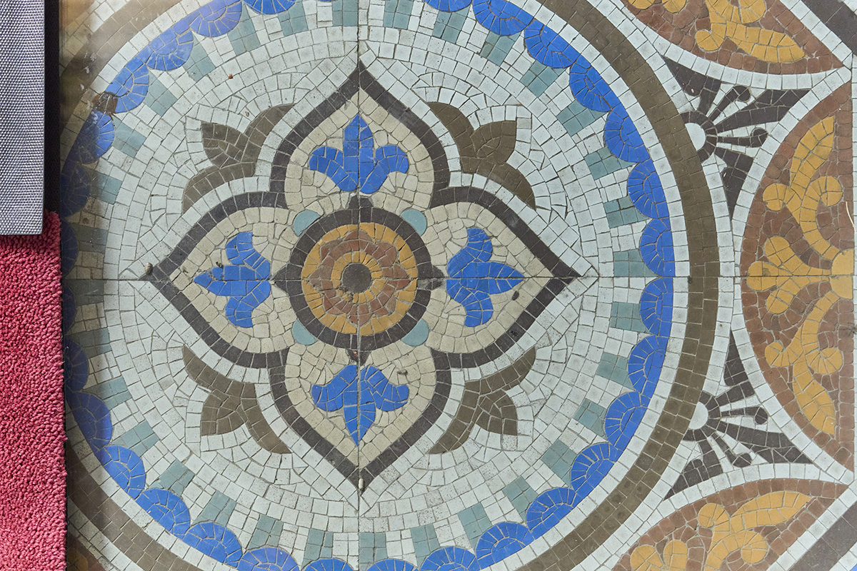 正面玄関の床に敷かれているタイルにも注目です。目地がなく、繊細な美しさ。美しいタイルが玄関以外にもベランダの床や暖炉周辺など、館内の随所に使用されています。