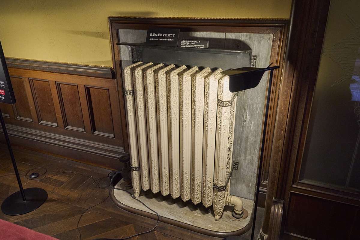 玄関ホールにあるスチームヒーターは当時最先端の暖房技術としてアメリカから導入されたものだそうです。現在は使われておりませんが、当時のまま残っています。