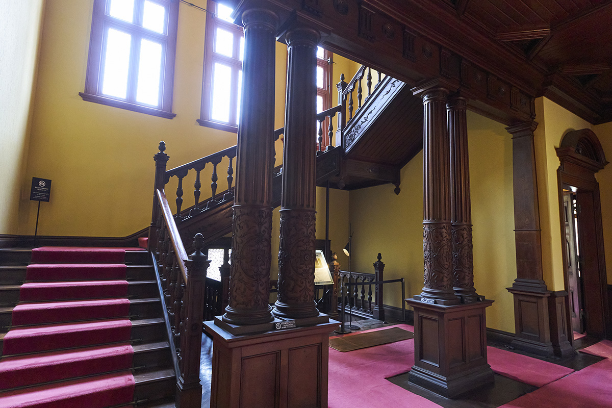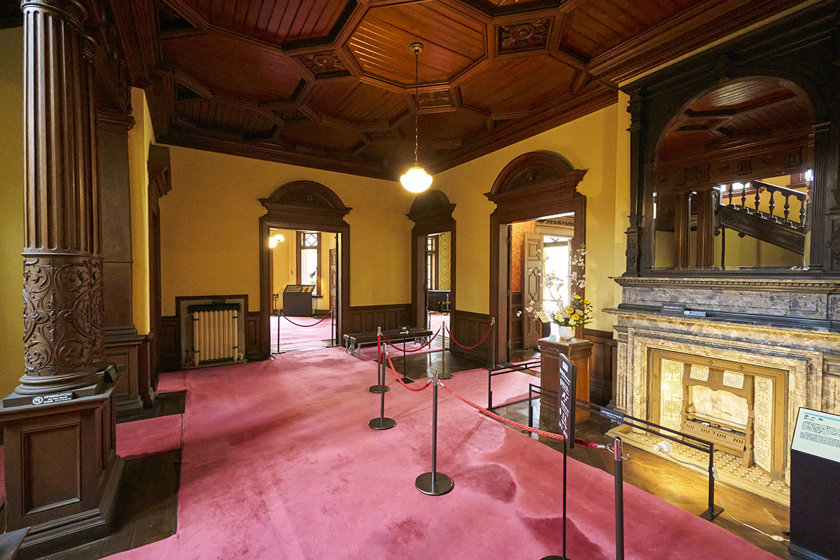 洋館の見学は、順路の通りに進みます。こちらが、洋館1階のホール。写真中央に見える柱は地下から2階まで続くもので、中に鉄柱が通っている岩崎邸の大黒柱です。左の階段は元々は柱がなく壁付けの空中階段だったそう。当時はこの階段を下りると、通常非公開の地下道を通って別棟の撞球室(どうきゅうしつ=ビリヤード場)へと行くことができたそうです。