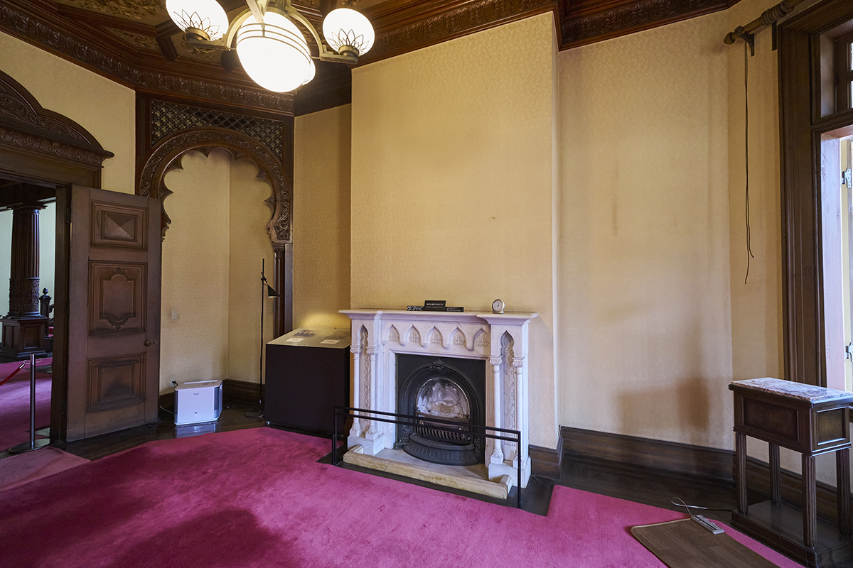 こちらが、洋館1階の婦人客室。設計者であるコンドルが好んでいたという、イスラム風のデザインが取り入れられており、暖炉のデザインもイスラム風です。当時、社交界では食事前後などに男性女性が分かれて過ごす文化があったため、男性は撞球室で、女性はこの部屋でくつろいで過ごしたとか。
