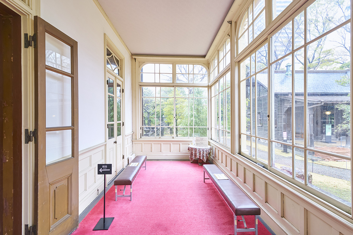 こちらは、明治後期に増築されたといわれるサンルーム。窓ガラスの一部は、当時のふきガラスがそのままはめこまれており、ところどころにゆがみが見られます。サンルームの下には、洋館と撞球室をつなぐ地下道が設けられています。
