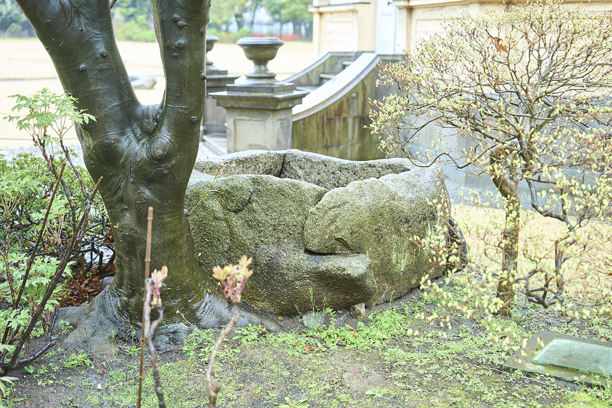 サンルームの窓からは、井戸のような四角形の石組が見えます。これは、地下道のための通気口。写真右に見えるガラスの部分は、地下道に採光するように作られた窓です。