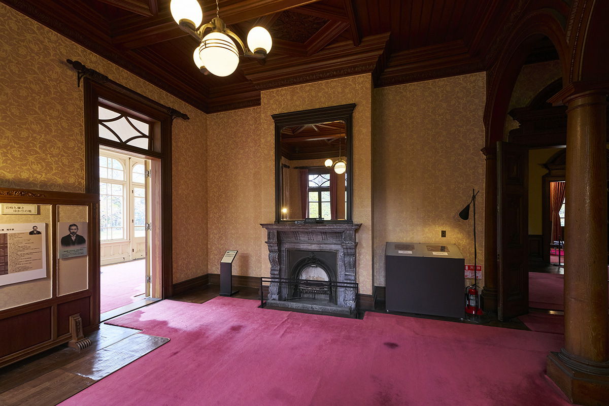 次は、客室や集会室がある2階へ。壁紙に使われているのは、岩崎邸のシンボルでもある伝統工芸品の金唐革紙(きんからかわし)。「旧岩崎邸庭園」では部屋ごとに色味やデザインの趣がすべて異なります。現在はじゅうたんが敷かれているため見えないですが、床の寄木も各部屋によってデザインが異なっていたとか。各部屋の壁にあしらわれている金唐革紙などの壁紙も部屋によって雰囲気が違うので、ぜひ注目してみてください。