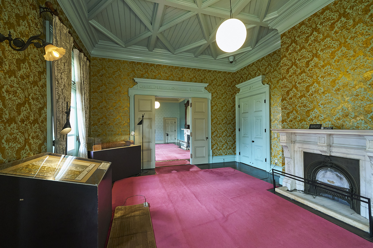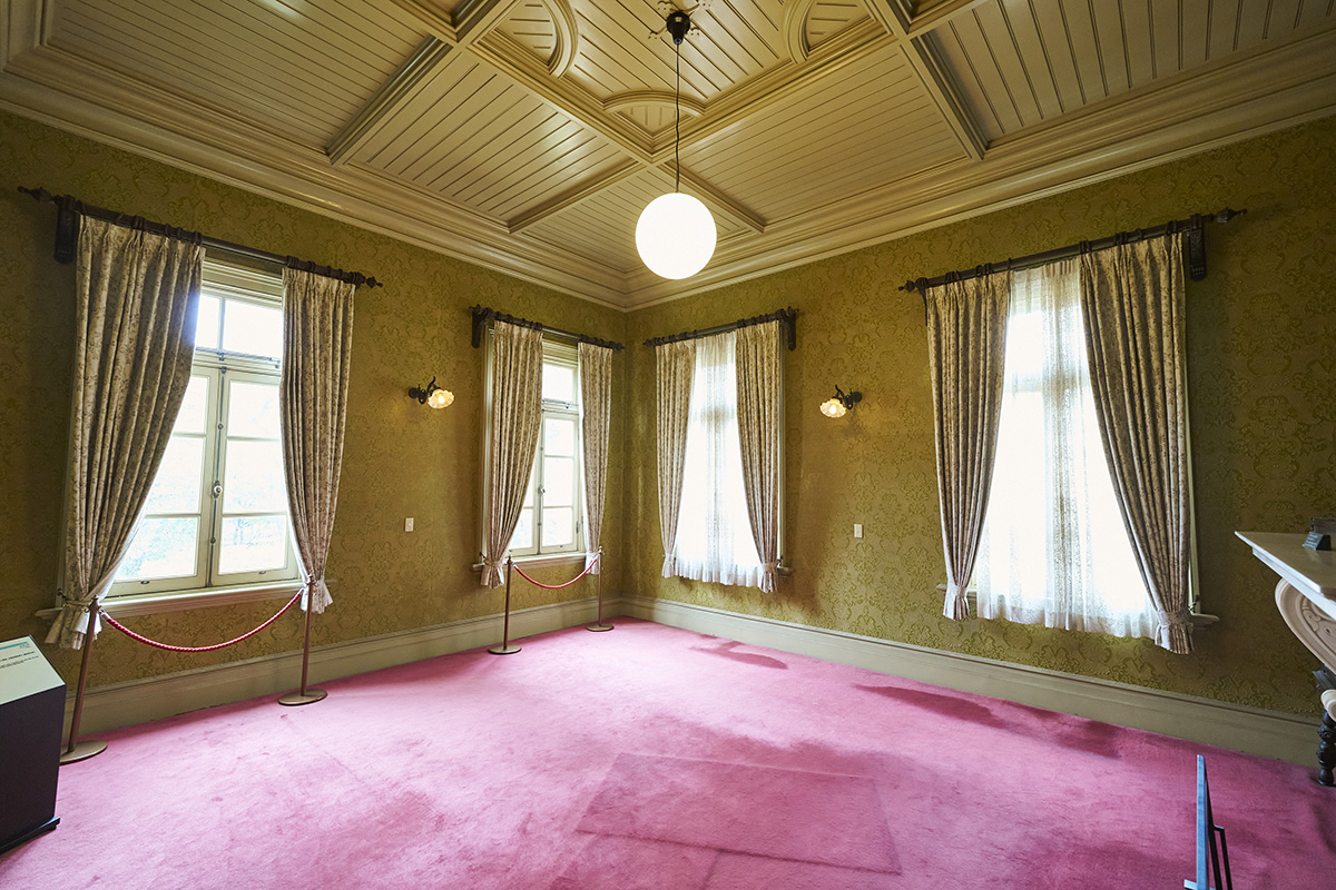 こちらが、2階南東の客室です。先ほどの客室より、さらに豪華な雰囲気の内装に仕上がっています。この部屋には、金唐革紙ができるまでの過程が展示されているので着目してみましょう。