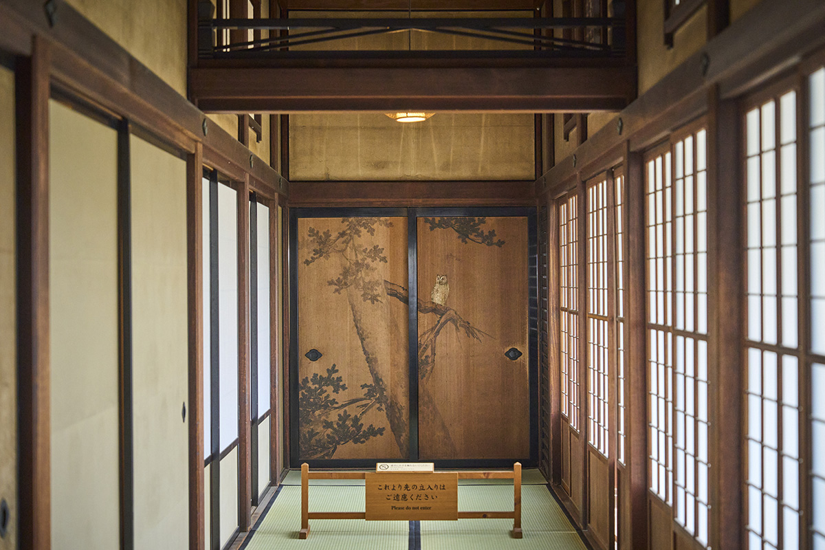 奥のふすまには、明治を代表する日本画家・橋本雅邦(はしもとがほう)が描いたと伝えられる障壁画などが残っています。