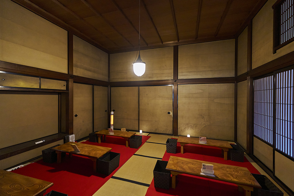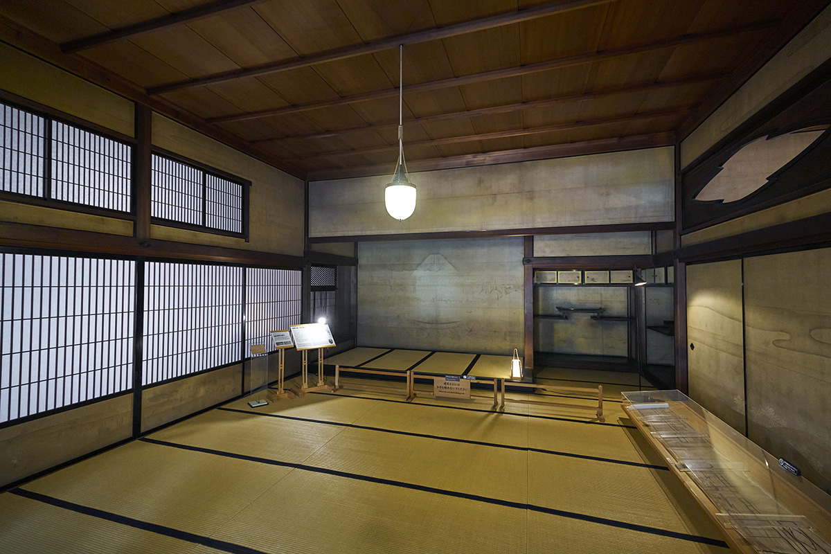 お茶をした後は、和館を少し見学しましょう。完成当時は、洋館よりも和館のほうがはるかに広かったそうですが、現在では取り壊しを経て一部のみが残っています。部屋の各所には三菱財閥のシンボルである「菱紋(ひしもん)」がモチーフとなったしつらえが見られ、ふすまには富士山の絵も見られます。部材のひとつひとつは、現在では入手困難な木材。当時の様子そのままを、じっくり観察しましょう。