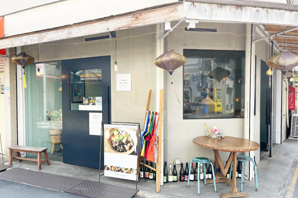 東急東横線 祐天寺駅から徒歩約4分の商店街にたたずむ「Stand Bò Bún」。ベトナムの街角を思わせるようなローカルな雰囲気が漂います。