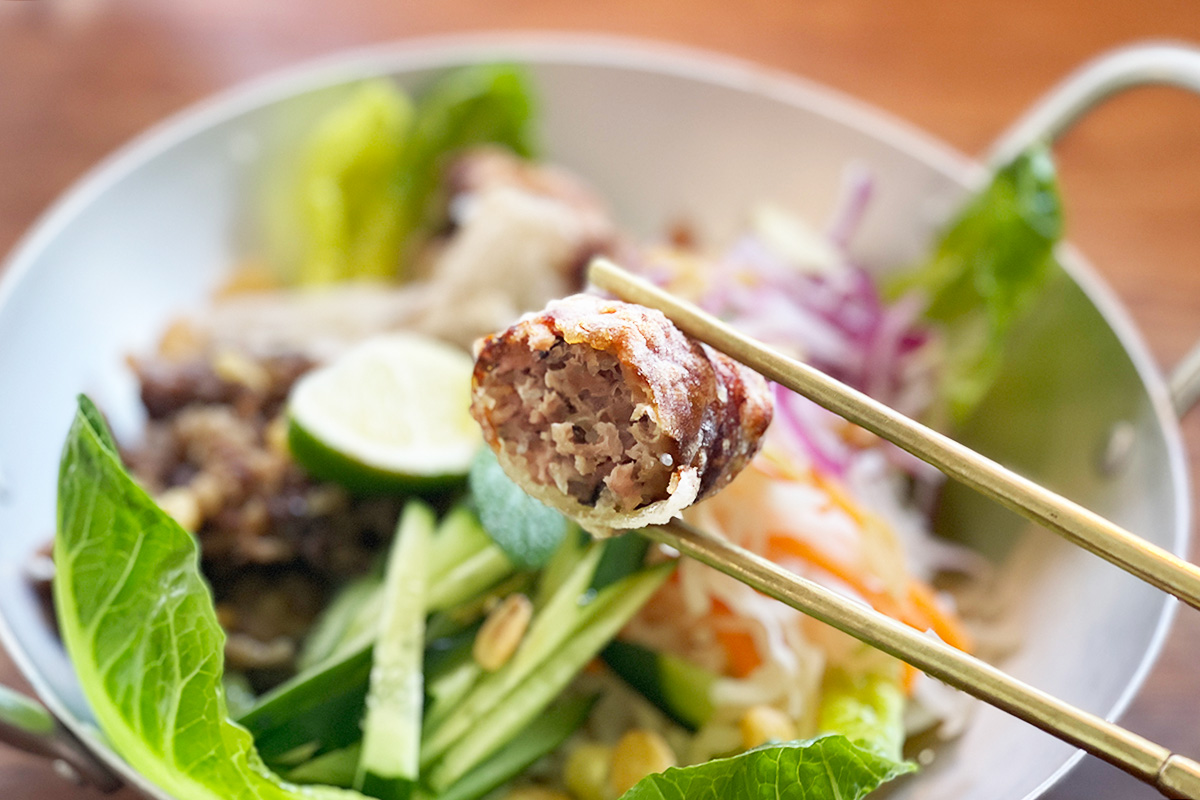 「ボブン」には揚げた春巻きも欠かせません。サクッとジューシーな皮の中にはシイタケ、豚肉、春雨などがぎっしり。皮にはライスペーパーが使用され、揚げることで生まれる軽やかな食感が特長です。ニョクマムとニンニクだけのシンプルな味付けで素材のうま味が引き出されています。