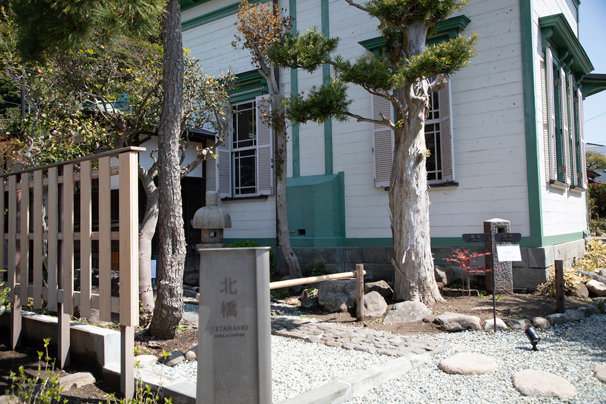 2024年6月に長谷にオープンした「鎌倉 北橋(かまくら きたはし)」は、大正時代に建てられたという、鎌倉市の景観重要建築物の旧加賀谷邸(きゅうかがやてい)を活用した、そば店とカフェが隣接したお店です。入り口は一見してレトロな洋館のたたずまいですが、奥には日本家屋が連なっているという粋なつくり。手前の洋館ではコーヒーとスイーツを、奥の日本家屋ではそばをいただくことができます。