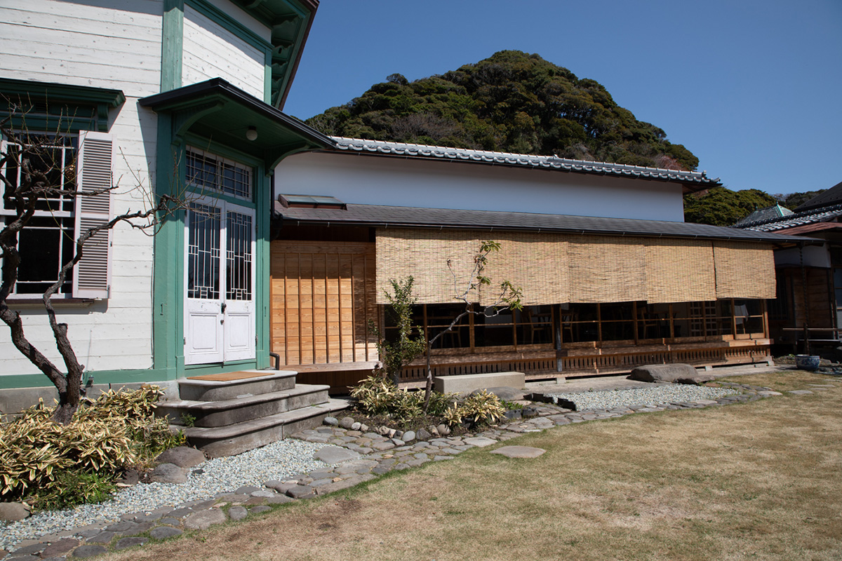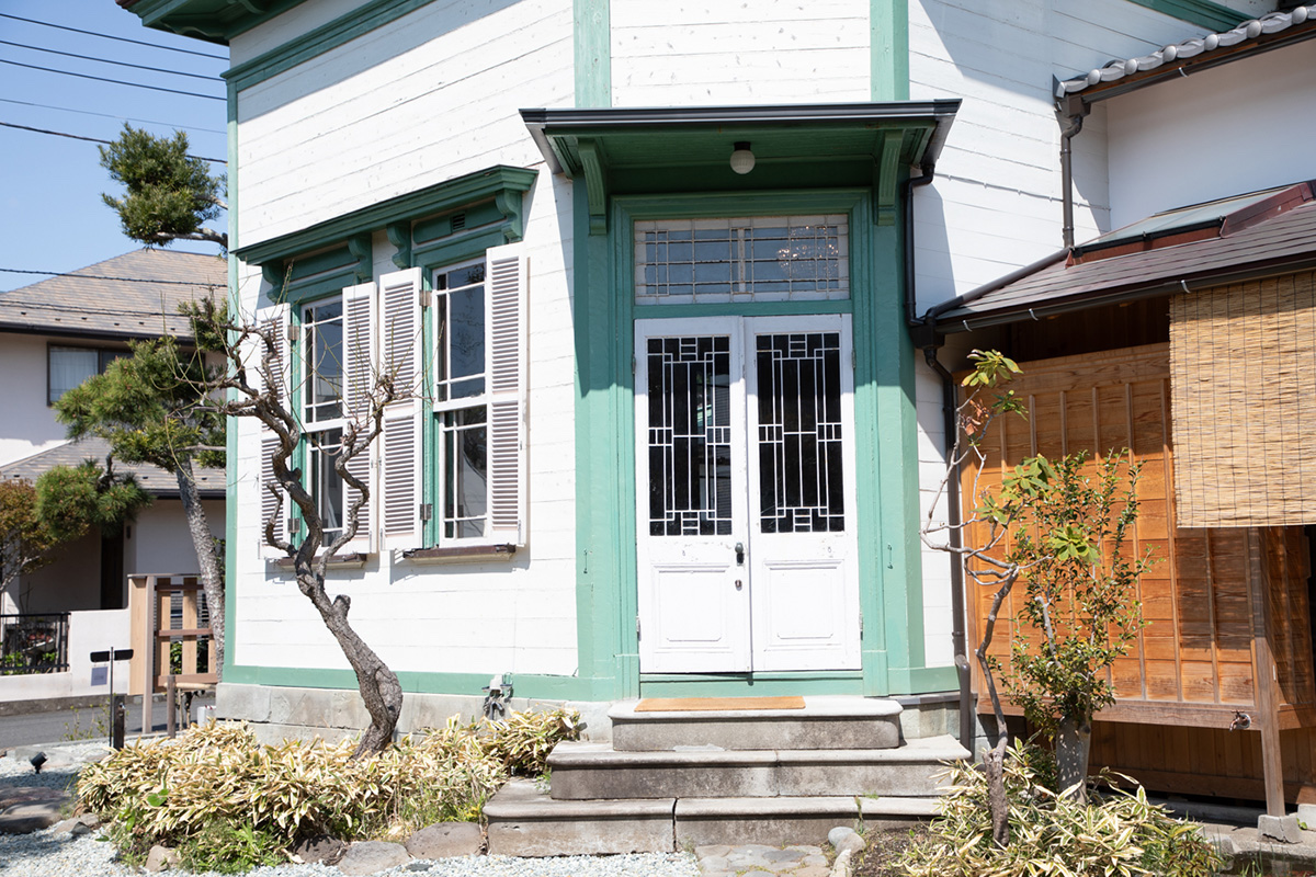 入り口から見ると白い壁にエメラルドグリーンの差し色がモダンな洋館ですが、奥には日本家屋が隣接しています。この建物は大正時代に建てられたと伝わる、鎌倉市の景観重要建築物の旧加賀谷邸を改装したものです。