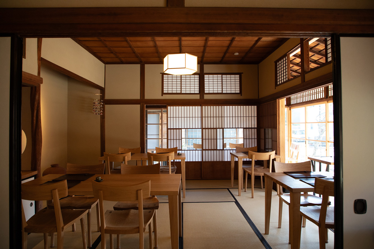 そば店は、どこか懐かしい温かみのある日本家屋。築100年の歴史が感じられる一方で、整えられた内装には新しさも感じます。それもそのはず、窓や床などの一部は当時のまま残しつつも、現在の耐震基準に合わせてリノベーションされているから。古木と白木のコントラストが素敵な空間です。手前には8畳の和室、障子で仕切られた奥には10畳の和室があり、そこに客席が設けられています。
