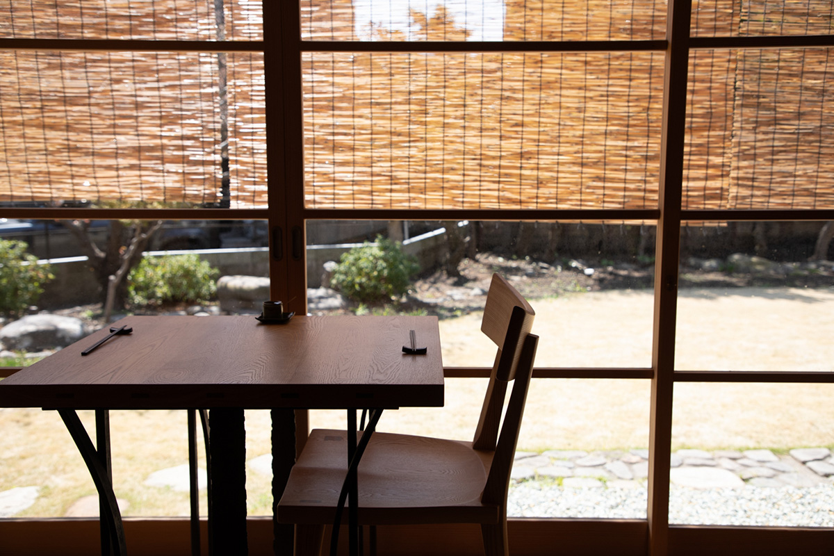 いい光が差し込む庭を眺められる窓際で、そばの後のコーヒータイムを楽しむことにしましょう。カウンターに並ぶ椅子の背もたれと窓枠の感じもマッチした、モダンな雰囲気です。