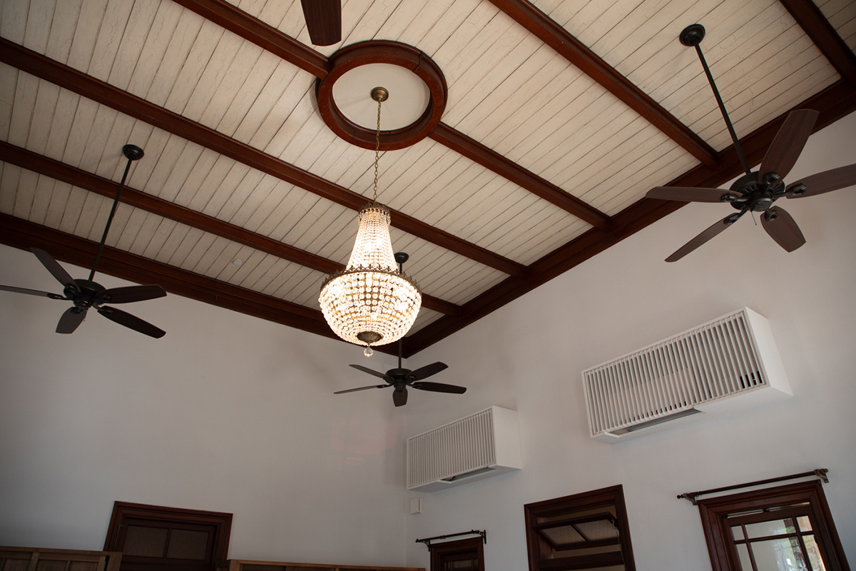 天井は高く、中心にはシャンデリアが光る開放的な空間です。かつてダンスホールとして使われたこともあったそうですよ。隣の日本家屋とのコントラストを楽しみながら眺めつつ、どの席に座ろうか決めます。