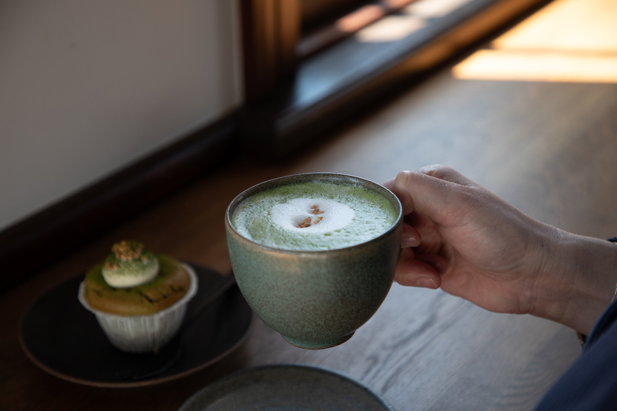 シーズナルドリンク「抹茶ラテ」(5月末までの期間限定)は、お店で丁寧に立てた抹茶とミルクの甘味が見事にマッチ。飲むとほうっ、と一息つくことができます。ミルクフォームの上にはそばの実が添えられ、たまにサクサク感と香ばしさも楽しむことができますよ。