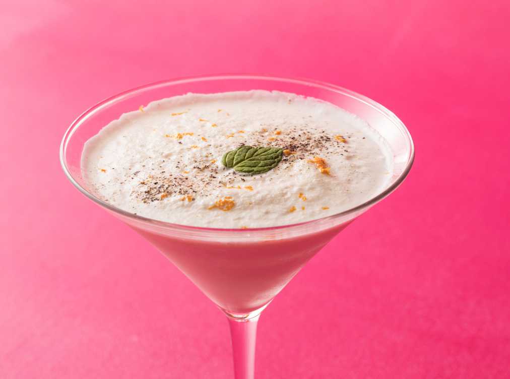 高級車“キャデラック”をイメージしたカクテル「ゴールデンキャデラック」をアレンジしてつくられた「White Cadillac (ホワイトキャデラック)」1500円。バニラアイスを使用したマイルドなテイストに、黒こしょう、オレンジゼストがあしらわれ、爽やかなテイストに。