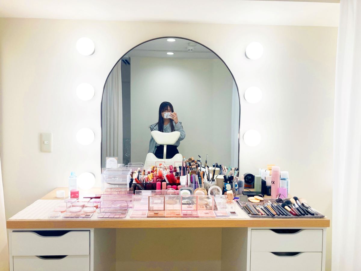 サロンの中にはメイク用のブース2台とヘアセット用のブースが1台あります。メイク用のブースには両側にライトが付いた女優ミラーが備え付けられていてテンション上がります!