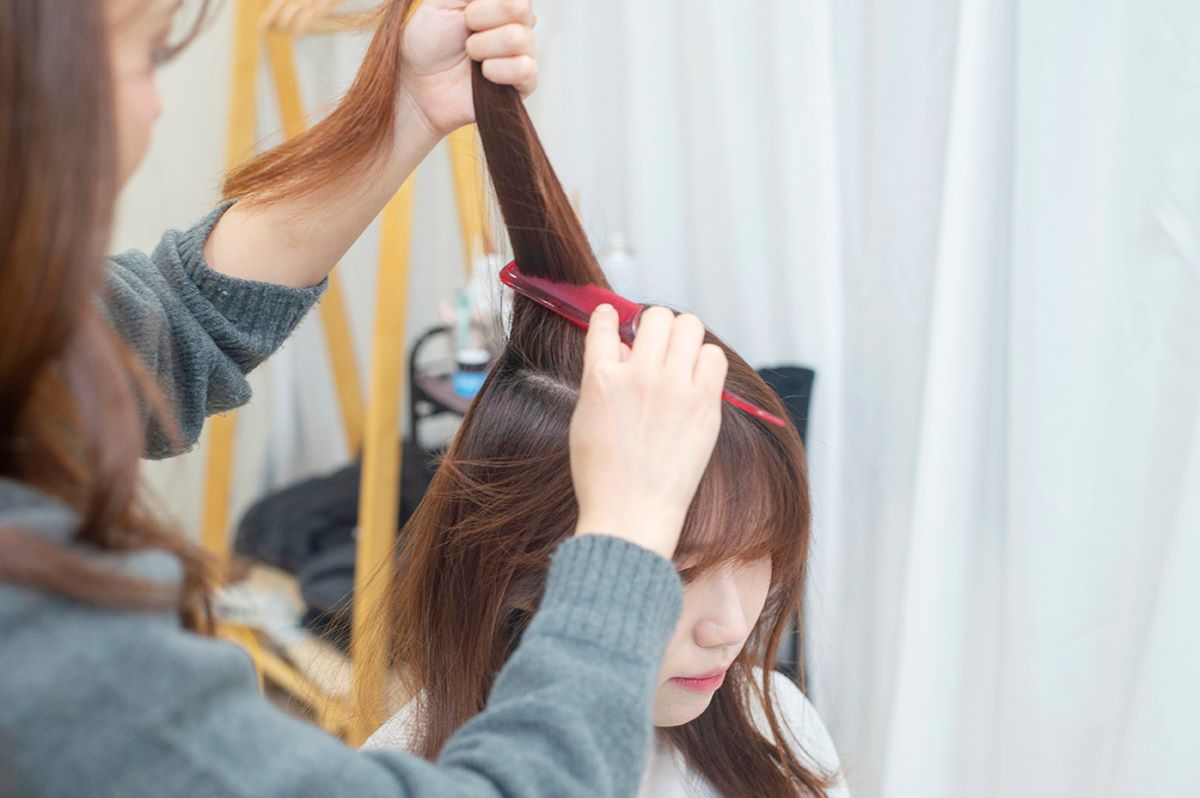 まずは髪全体をブロー。あとでヘアアイロンをしやすいように毛の流れを整えたあと、根元をしっかりと立ち上げておきます。アップスタイルに限らず、ダウンスタイルの場合でも根元の立ち上げは重要で、これも韓国ヘアメイクの特長の一つ。