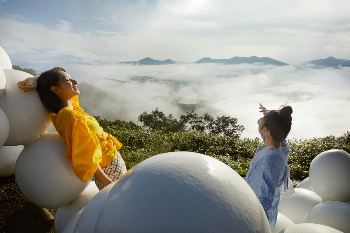 雲をつくる「雲粒」をイメージした直径40~60センチメートルの、弾力のあるクッションが連なって設置されています。全長約15メートルの展望スポットで、好きな場所に寄りかかったり座ったりと、自由な姿勢で楽しめます。まるで、雲の上にいるかのような気持ちで、雲海を眺められるのが特徴です。