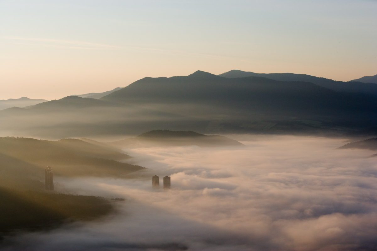 風が弱く晴れた日、放射冷却で冷やされた空気が、盆地状の地形の底にたまることで発生する雲海です。この「トマム産雲海」が発生する朝は、山麓よりも山頂の気温が高くなり、低い雲海が発生し、リゾナーレトマムやトマムザ・タワーが雲海の中から突き出て見えることがあります。