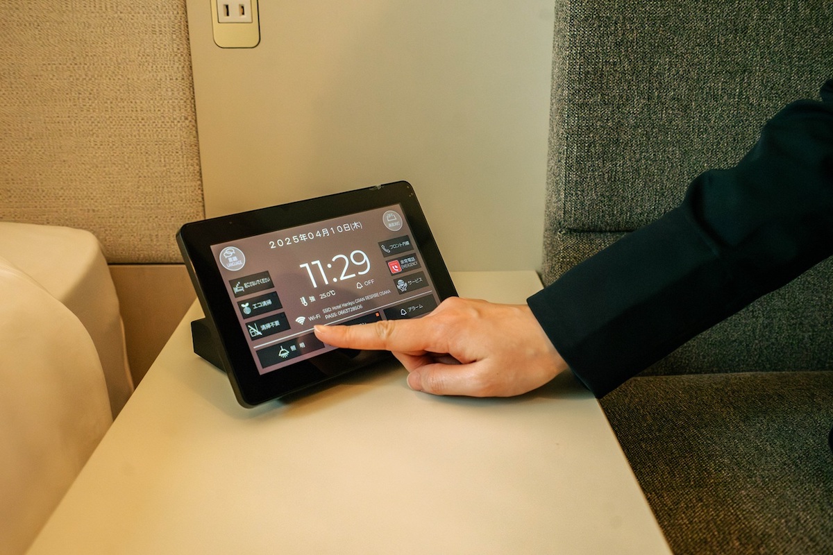ベッドサイドのテーブルには、部屋内すべての照明やエアコンなどを操作できるタブレットがあります。照明のボタンを探してうろうろしなくていいのは便利。