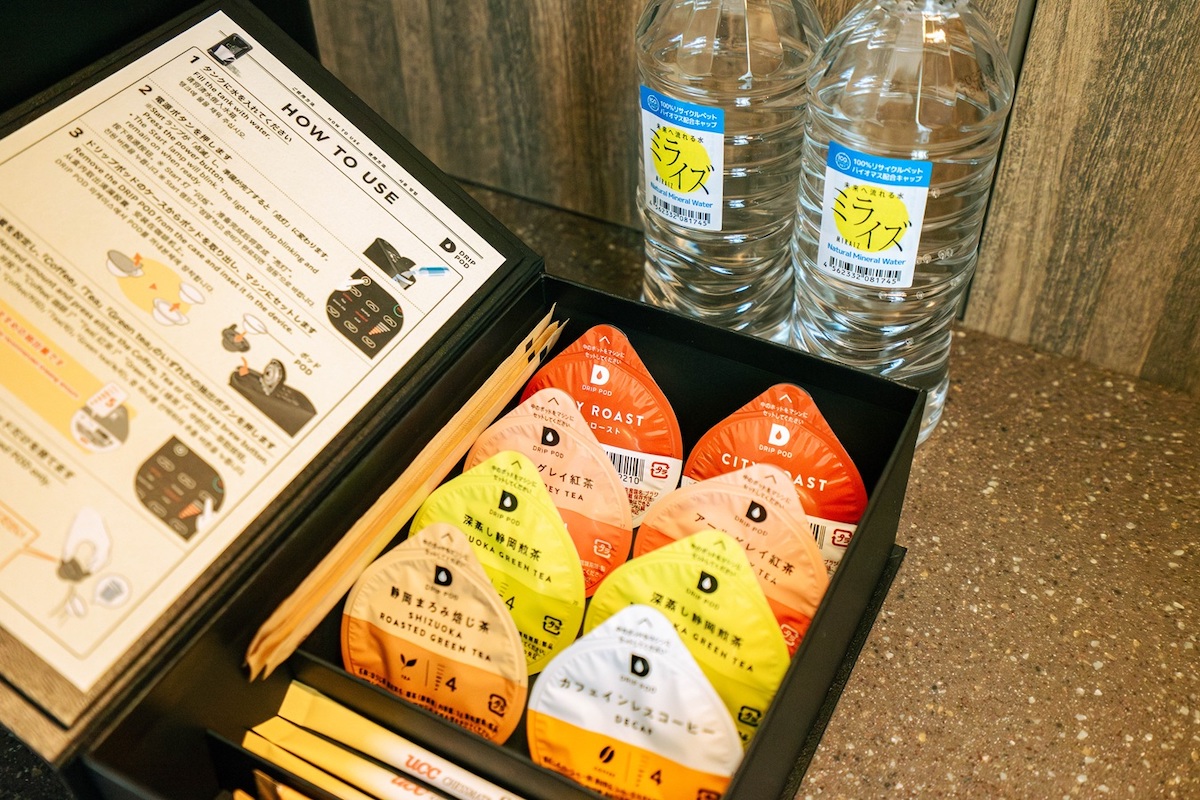 またカプセル式のコーヒーマシンと、コーヒー・紅茶・日本茶のカプセル、水2本を完備。もちろん無料で飲めるものです。