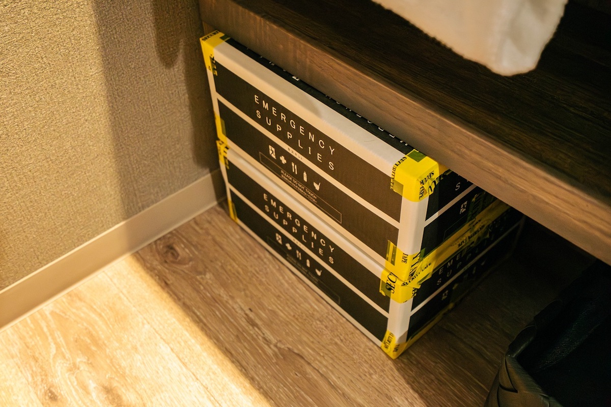 また全客室に、1人あたり3日分の水と食べ物を入れた災害備蓄品も収納。万が一の事態が起こった際にはホテルの案内を待たず宿泊者の判断で開けることができ、迅速な対応が可能です。