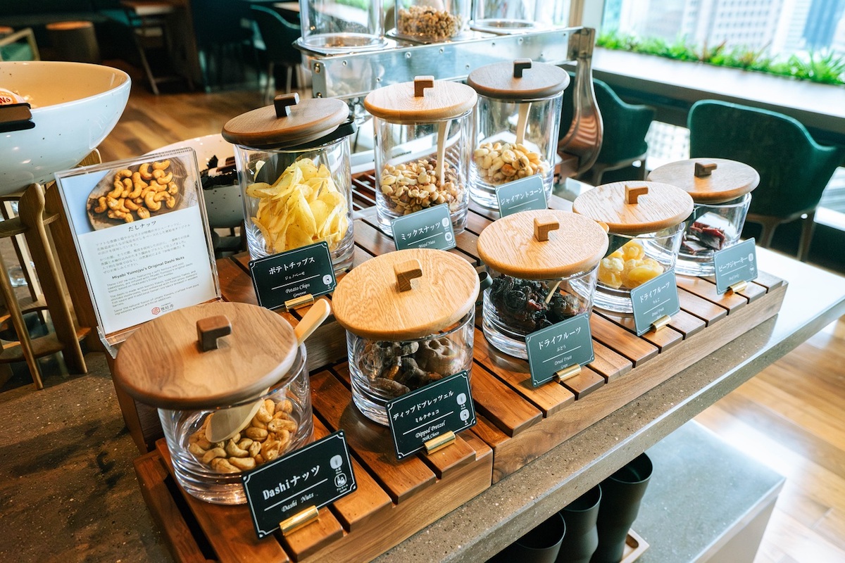 ここでは、ナッツ類やドライフルーツ、焼き菓子などの軽食を常時用意。