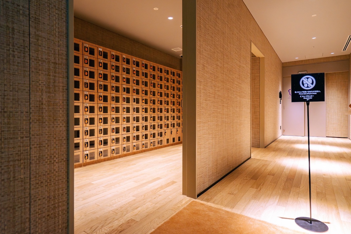 宿泊者専用エレベーターで4階まで降りたら、専用通路で 「うめきた温泉 蓮」へ。写真左のシューズボックスに履き物を入れ、裸足で進みます。