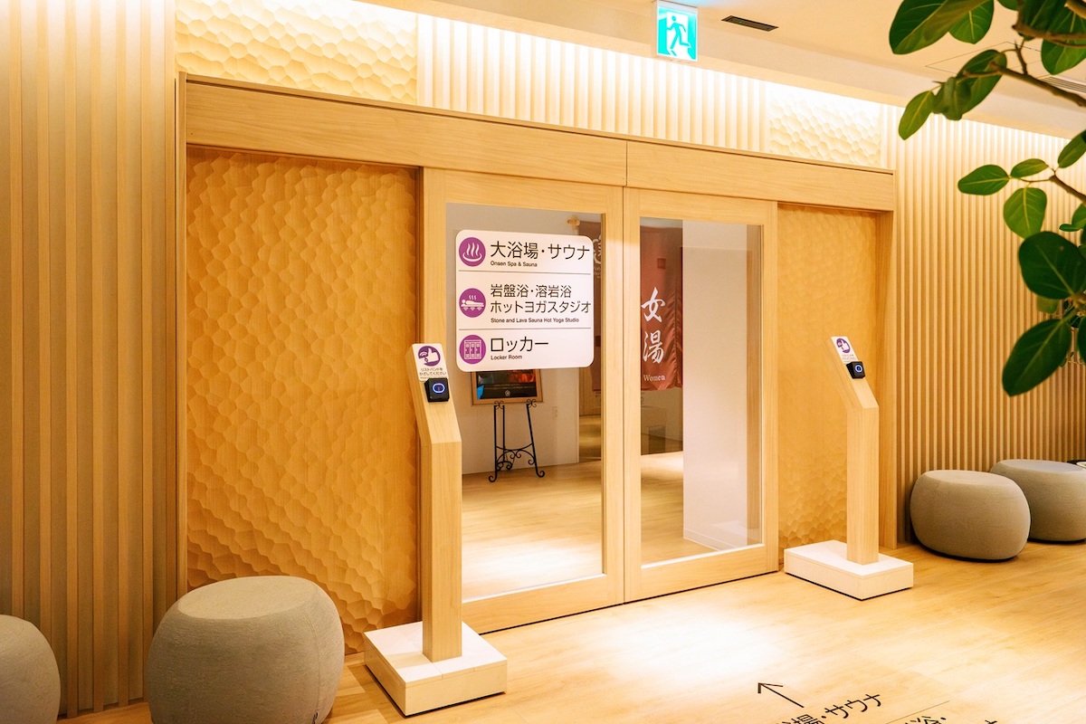 こちらが大浴場やサウナなどがある温浴施設の入口。旅館の温泉のような大浴場、ロウリュ演出もあるサウナ、全6エリアの岩盤浴・溶岩浴(別料金)など充実のラインナップに心が躍ります。