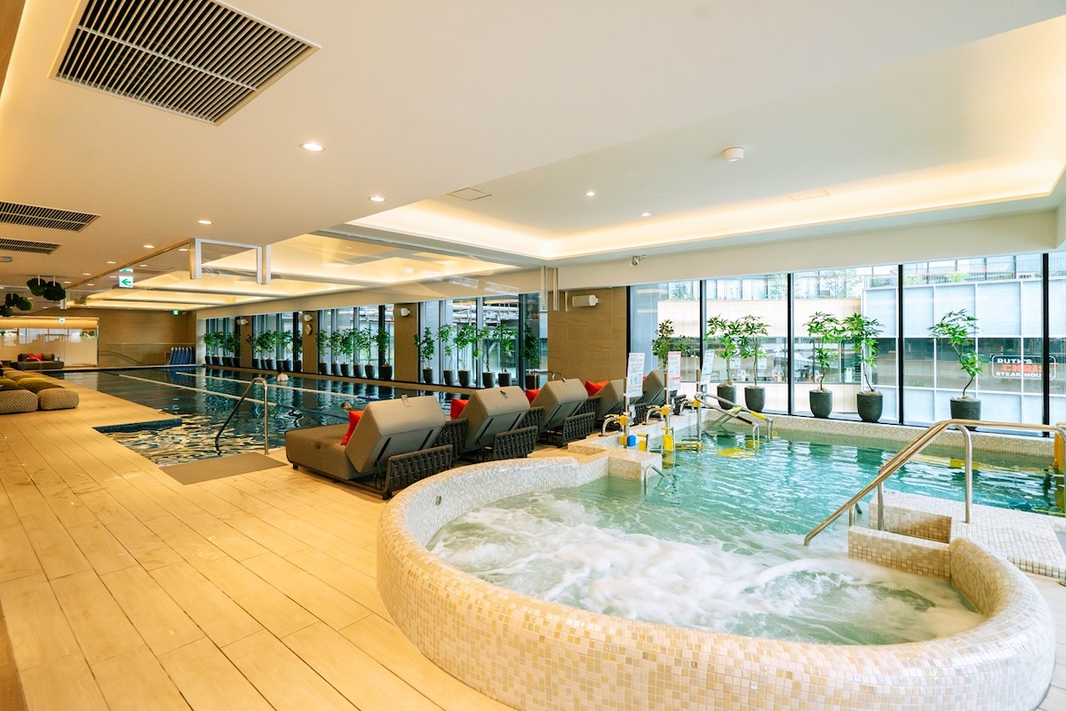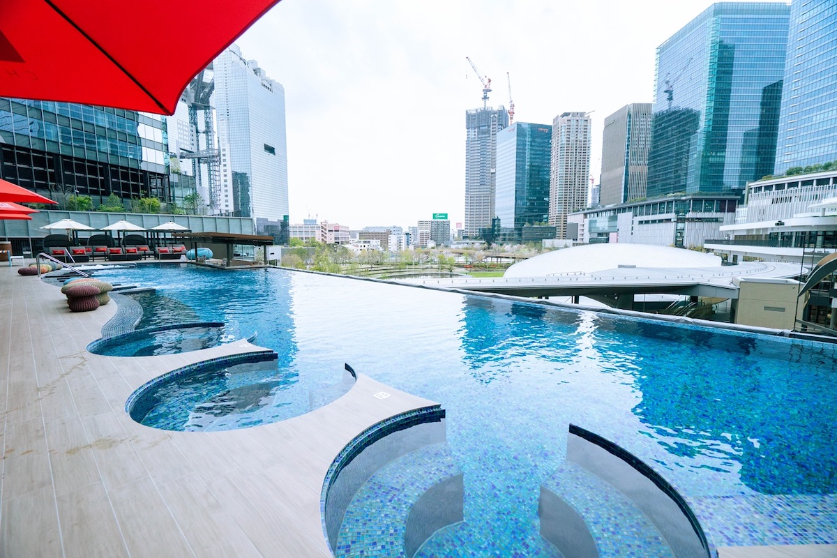 別料金にはなりますが、屋内プールの横に屋外温水インフィニティプール(平日2200円、土・日曜、祝日3300円)もあり。奥にはプールバーも用意され、リゾート気分に誘われつつ、うめきたの夜景を眺めてうっとり。