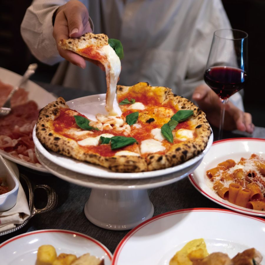 プランは、【CASUAL】から【PREMIO】まで全部で4つ。そのすべてで、通常のレストランメニューでも提供されている窯焼きの本格ピザ3種と、2種のソースで楽しめるリガトーニが食べ放題! どちらもオーダービュッフェ形式にて、できたて焼きたてが食べられます(※ピザとパスタ以外のコース料理は1人1品ずつの提供)。