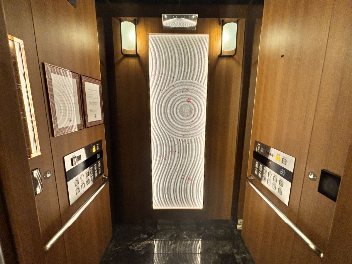 チェックインをしたらエレベーターでお部屋へ。エレベーターにも、わび寂びを感じる砂紋アートが飾られています。エレベーターは2台あり、それぞれ桜と紅葉があしらわれています。