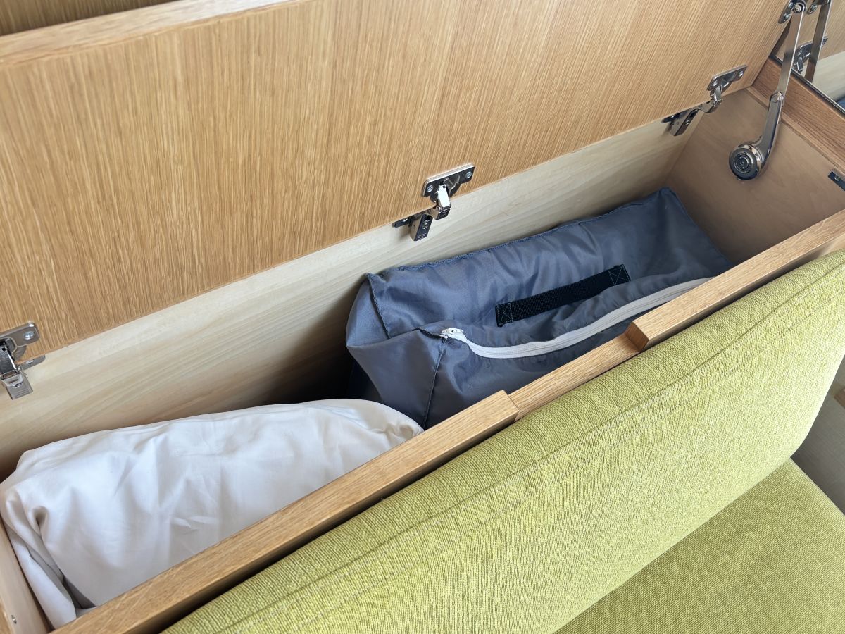 3人で泊まる場合は小上がりソファをエクストラベッドとして活用するのもOK。脇の収納スペースに、シーツや枕が用意されています。