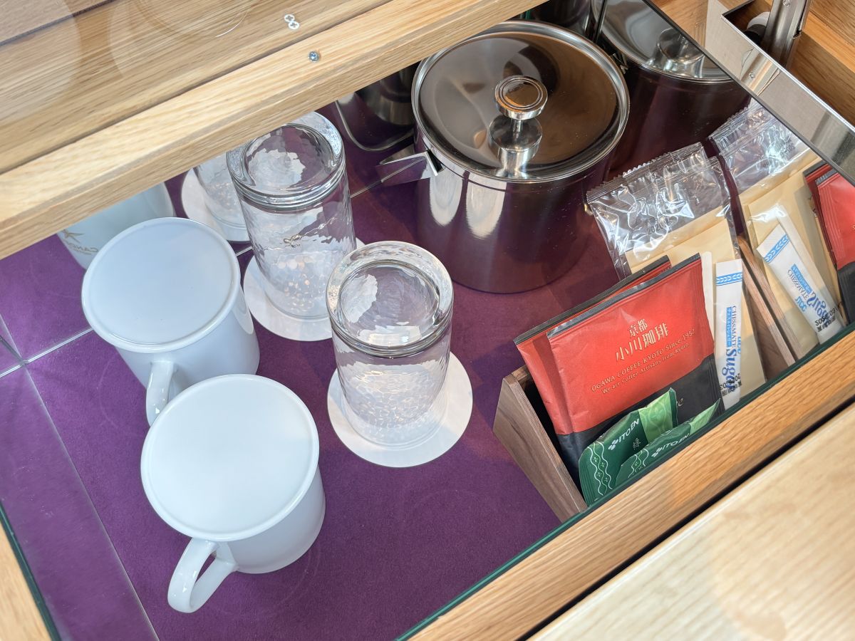 リラックスタイムには欠かせないコーヒーセットも完備。京都の老舗コーヒー店「小川珈琲」のコーヒーがアメニティとして用意されています。常温の水2本と電子ケトルもあり、いつでもおいしいコーヒーがいただけます。